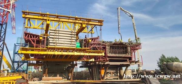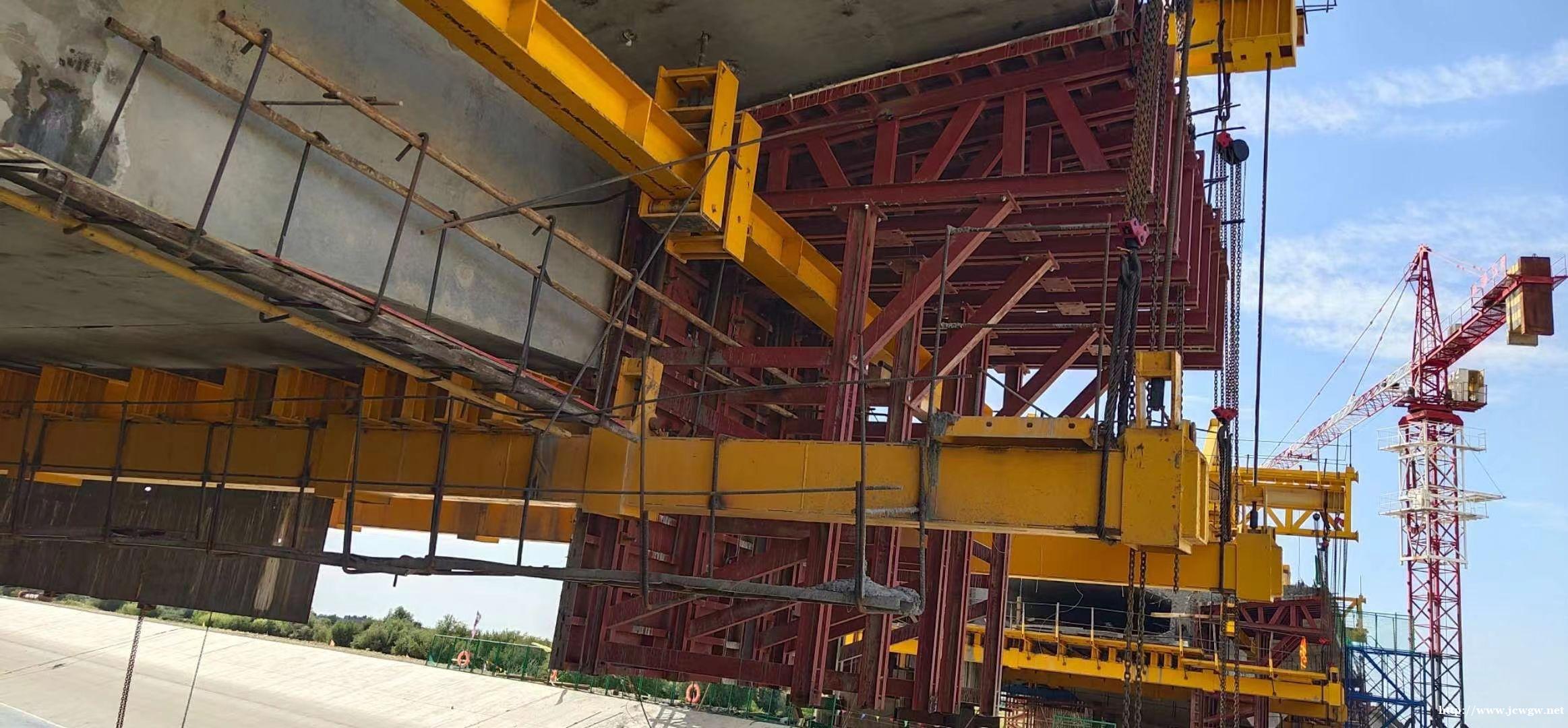 ⑹、外侧模板在吊篮的牵引下,依靠滑梁向前移动。同时用葫芦辅助。